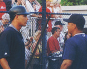 braintrust through the chain-link fence while Reggie talked hitting with youngsters